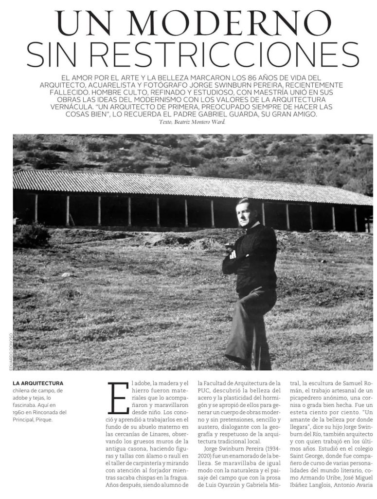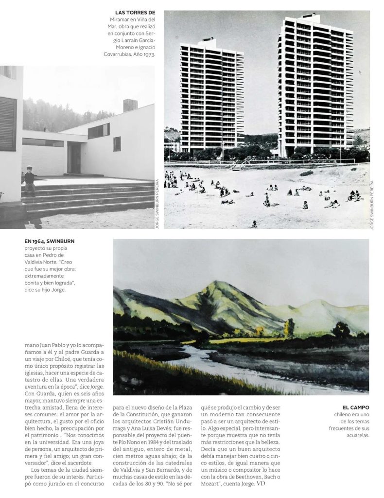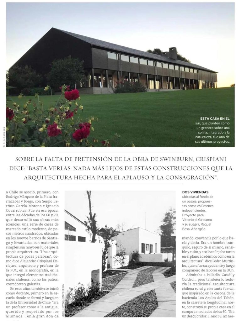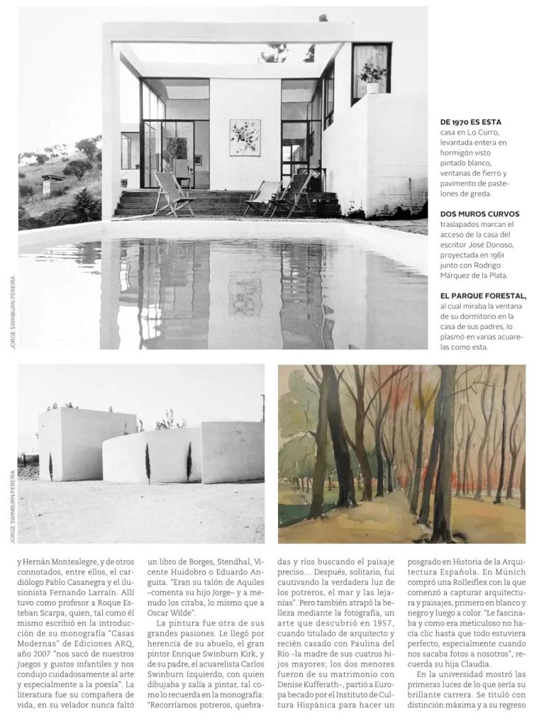 Revista VD de El Mercurio destaca la trayectoria y la obra del arquitecto, acuarelista y fotógrafo Jorge Swinburn, recientemente fallecido. Se cita su monografía Casas Modernas de Ediciones ARQ, donde escribe el profesor de la Escuela de Arquitectura, Alejandro Crispiani.