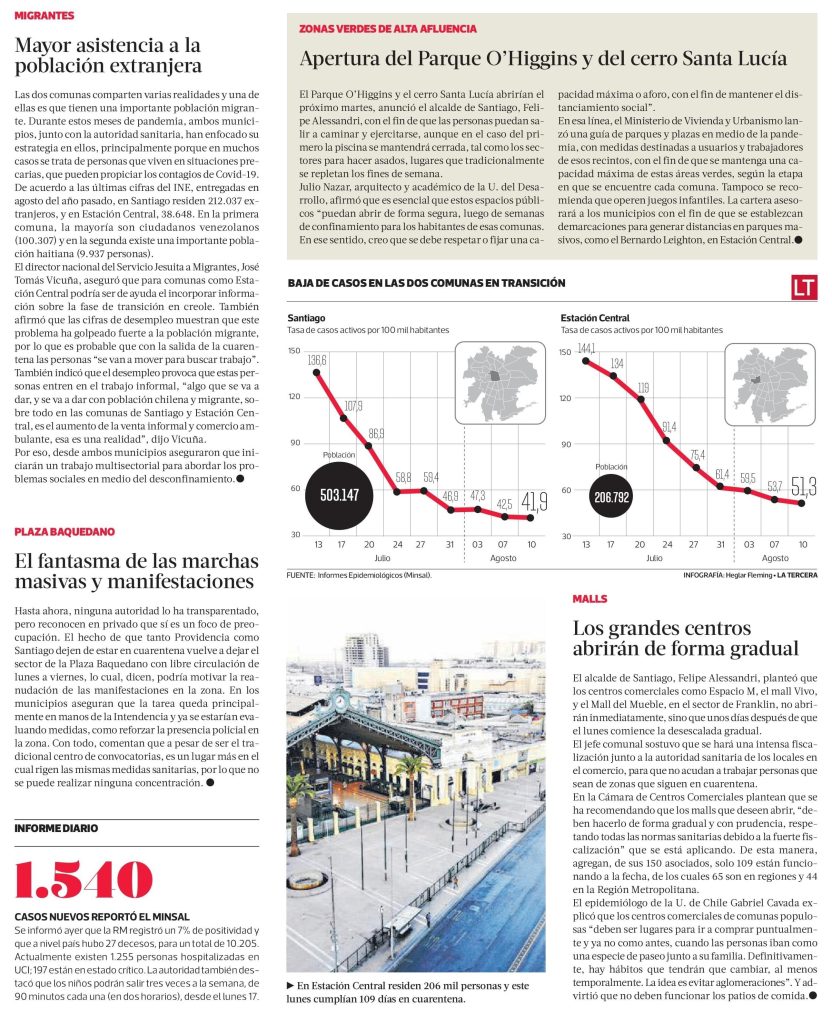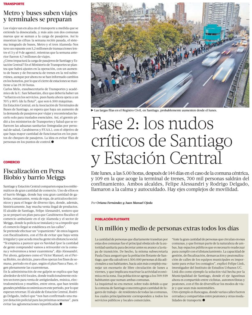 La Tercera destaca los nudos críticos de Santiago y Estación Central, que saldrán del confinamiento el lunes. Habla el investigador del Instituto de Estudios Urbanos, Felipe Link. + Revisa nota completa aquí.