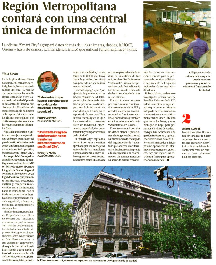La Tercera destaca que la Región Metropolitana contará con una central única de información que agrupará datos de más de 1.700 cámaras, drones, la Unidad Operativa de Control de Tránsito y Onemi. Habla el académico del Instituto de Estudios Urbanos, Roberto Moris.