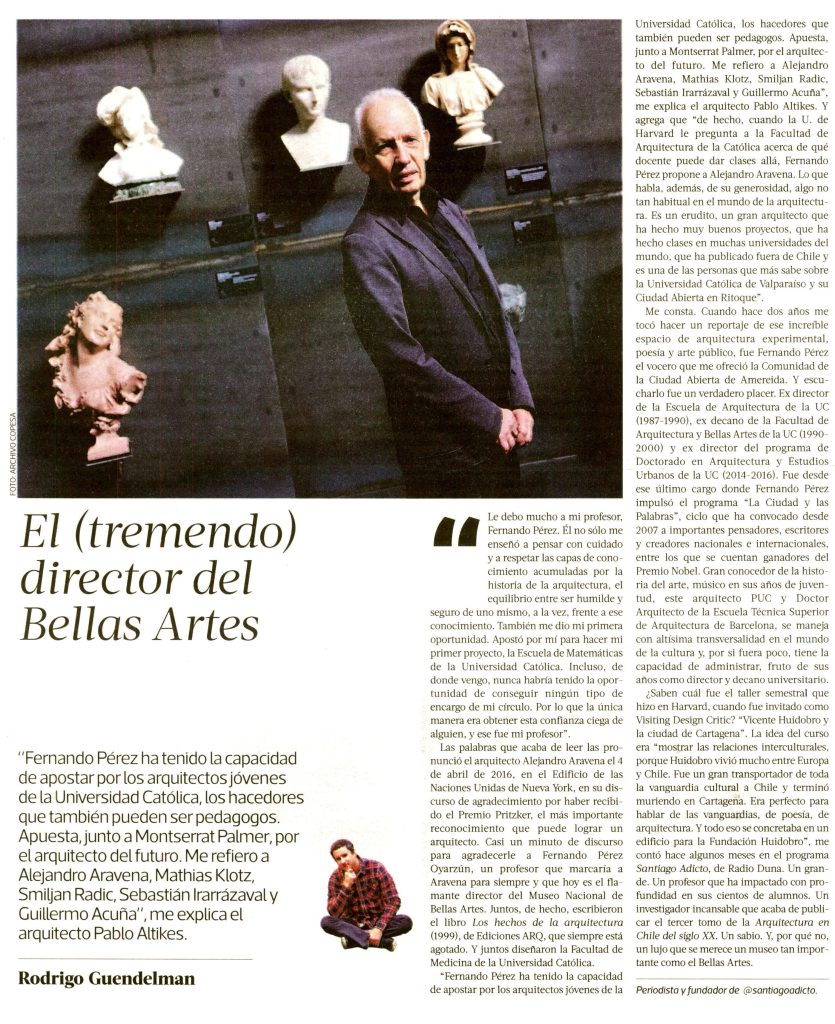 La Tercera publica columna sobre la trayectoria del profesor UC y actual director del Museo de Bellas Artes, Fernando Pérez. Se menciona que fue director de la escuela, decano de la Facultad de Arquitectura, Diseño y Estudios Urbanos, director del programa de Doctorado en Arquitectura y Estudios Urbanos, e impulsor del programa “La Ciudad y las Palabras”.