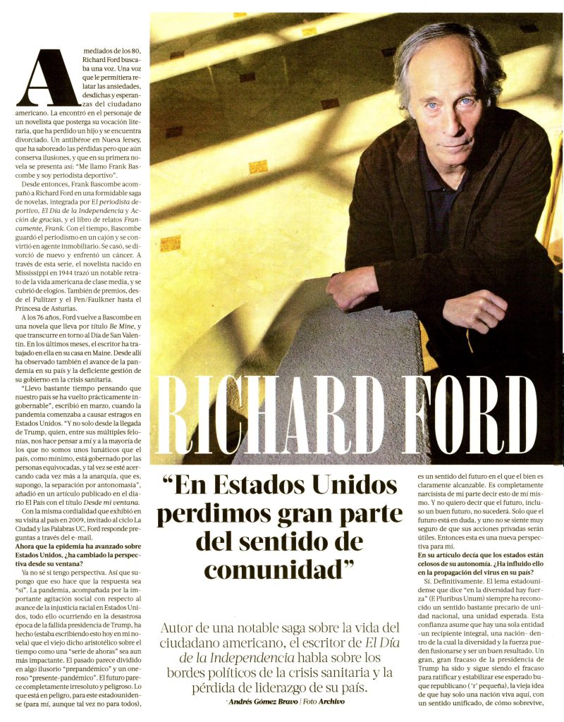 La Tercera entrevista al novelista estadounidense Richard Ford sobre los bordes políticos de la crisis sanitaria y la pérdida de liderazgo de EE.UU. Se menciona su visita al país en 2009, invitado al ciclo La Ciudad y las Palabras de la UC.