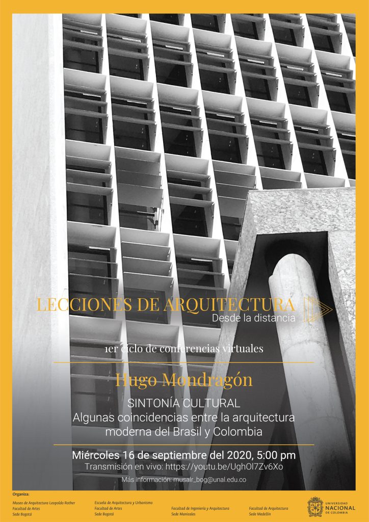 El profesor de la escuela de arquitectura UC, Hugo Mondragón, impartirá a las 17:00 horas (19:00 horas en Chile) del próximo miércoles 16 de septiembre la conferencia titulada “Sintonía Cultural: algunas coincidencias entre la arquitectura moderna del Brasil y Colombia”.