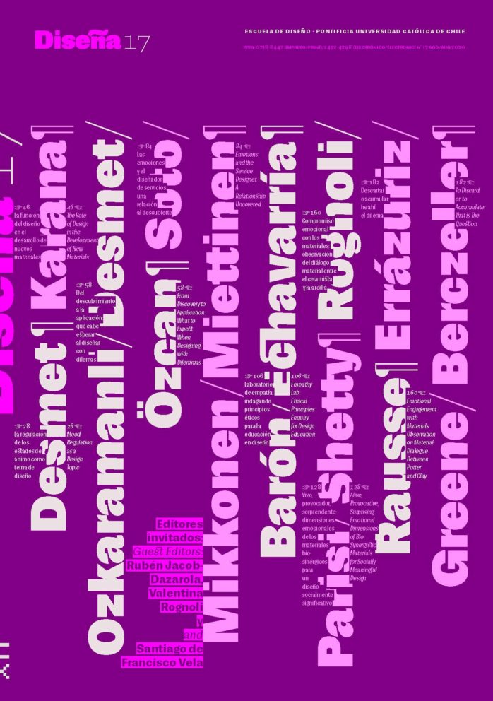 Editado por Rubén Jacob-Dazarola (U. de Chile), Valentina Rognoli (Politécnico de Milán) y Santiago de Francisco Vela (U. de los Andes, Colombia), este número extiende la discusión sobre los alcances éticos del diseño, abordando aspectos humanos como los estados de ánimo, los sentimientos y los afectos, así como la relación entre los objetos, las
