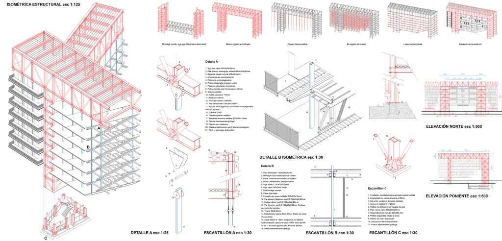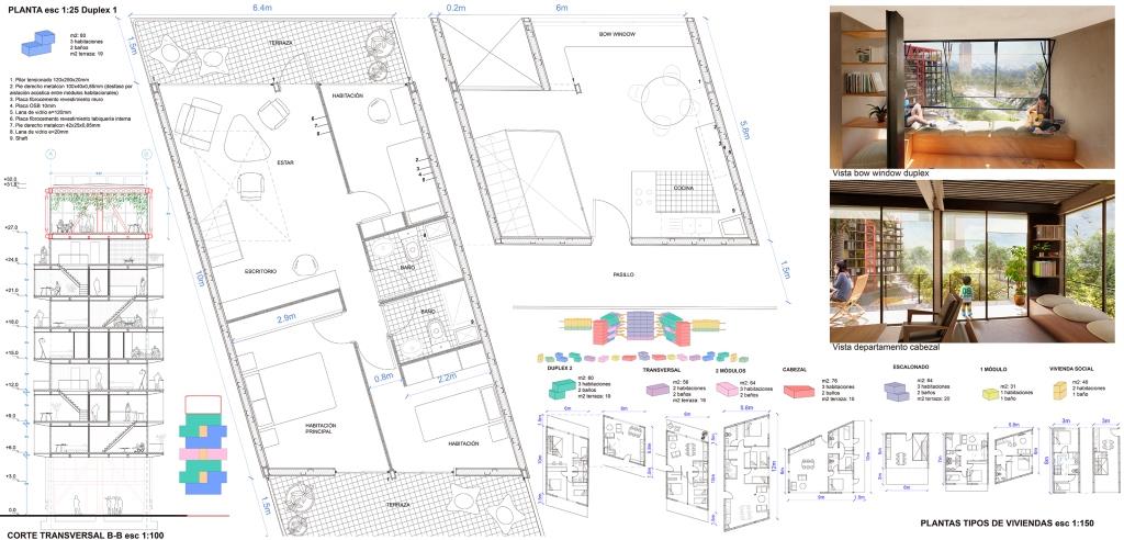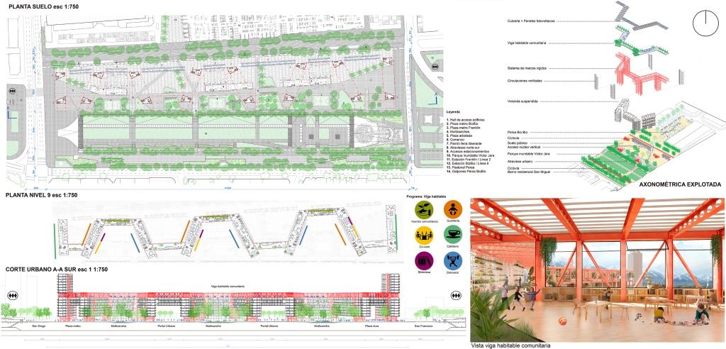 El proyecto —de 400m de largo x 50m de ancho—, libera la primera planta, generando un suelo público flexible en usos. De esta manera acoge tanto el comercio formal del Persa Bío Bío como también los comercios informales y la feria itinerante del sector, otorgando continuidad al tejido urbano del barrio. Para esto, se estableció un sistema de marcos rígidos construidos en acero, los que salvan luces de hasta 30 m de largo y de los cuales se suspenden losas de planta libre que a su vez soportan un sistema de viviendas prefabricadas que pueden mutar en el tiempo. La Viga superior del marco rígido genera un paseo de 750 metros de largo, habitado mediante distintos equipamientos comunitarios, tales como guarderías, áreas de co-work, huertos verticales, biblioteca, gimnasio y cafetería.