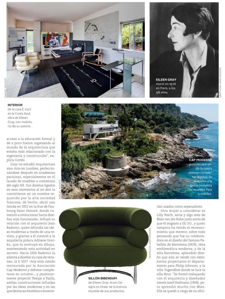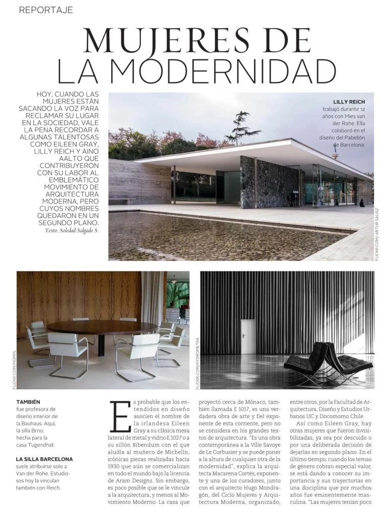 Revista VD de El Mercurio destaca a mujeres que contribuyeron al movimiento de arquitectura moderna, pero cuyos nombres quedaron en un segundo plano, como Eileen Gray, Lilly Reich y Aino Aalto. Habla la profesora de la Escuela de Arquitectura y Directora de Comunicaciones y Extensión FADEU Macarena Cortés, una de los curadores, junto con el arquitecto Hugo Mondragón, del Ciclo Mujeres y Arquitectura Moderna. La actividad es organizada, entre otros, por la Facultad de Arquitectura y Docomomo Chile.