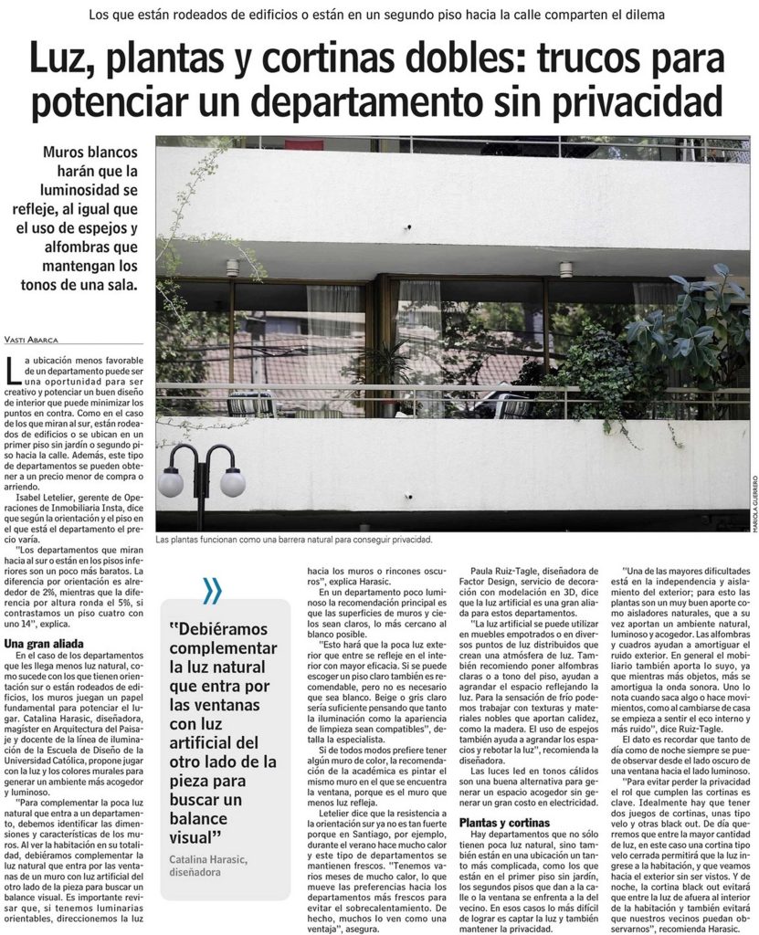 Las Últimas Noticias destaca que expertos entregan consejos para potenciar un departamento sin privacidad: luz, plantas y cortinas dobles. Habla la profesora de la Escuela de Diseño, Catalina Harasic.