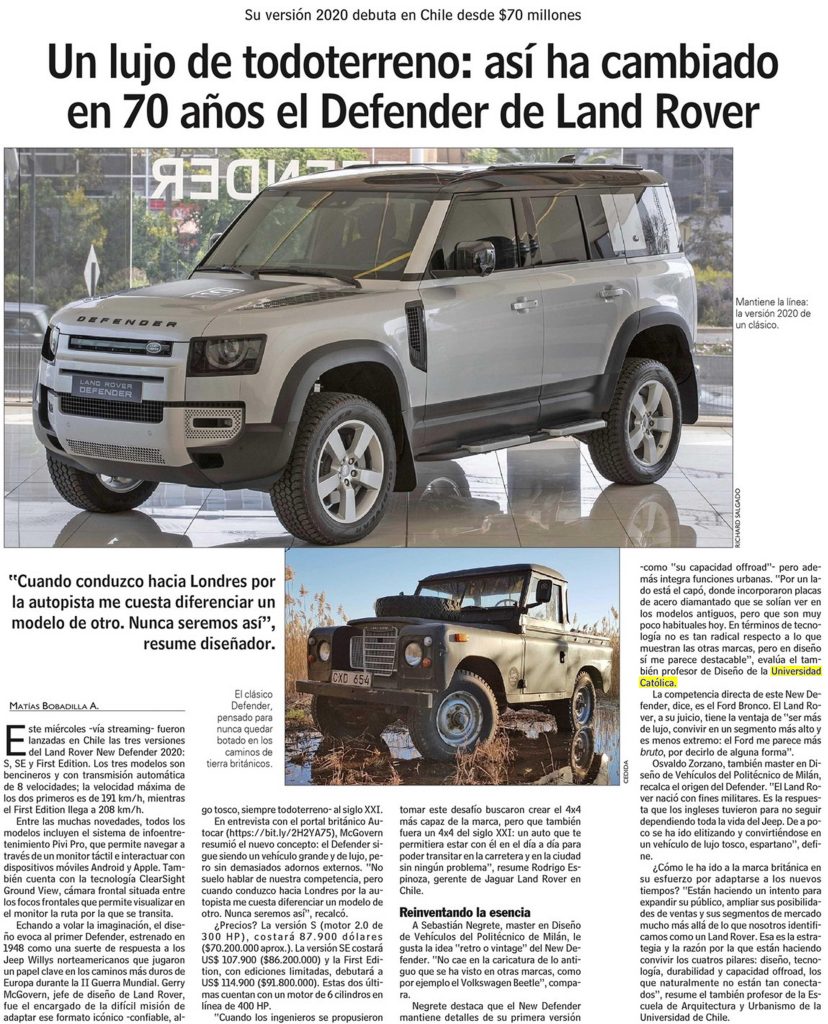 Las Últimas Noticias destaca llegada a Chile de la versión 2020 del Defender de Land Rover. Habla el profesor de la Escuela de Diseño, Sebastián Negrete.