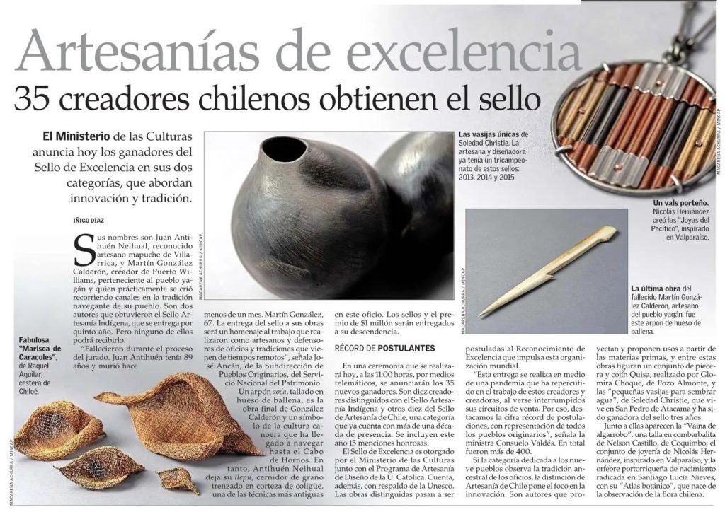 El Mercurio destaca que el Ministerio de las Culturas anuncia hoy los ganadores del Sello de Excelencia en sus dos categorías: Sello Artesanía Indígena y Sello de Artesanía de Chile. El reconocimiento es otorgado por el Ministerio junto con el Programa de Artesanía UC.