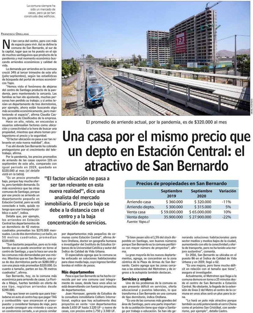 Las Últimas Noticias destaca aumento de demanda por arriendos en la comuna San Bernardo por bajos precios y mejor calidad de vida. Habla el  investigador del Instituto de Estudios Urbanos, Arturo Orellana.