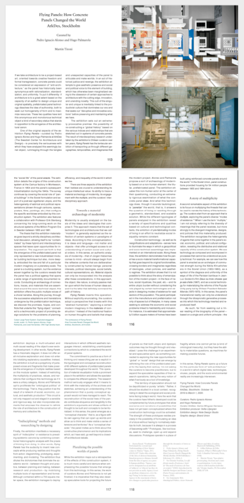 En el artículo Tironi plantea: “Uno de los aspectos originales de la exposición Flying Panels (…) es precisamente su apuesta por tratar con seriedad el análisis de este objeto aparentemente ‘banal’, hurgando en los enredos y capacidades insospechadas del panel para articular y hacer mundos. (…) La exposición plantea una premisa sumamente provocativa: la posibilidad de reconstruir una ‘historia global’ a partir de los diversos índices y relaciones que se esbozan en sistemas de paneles de hormigón. (…) El panel es un sistema de construcción, pero la evidencia entretejida por los curadores revela que el panel tiene una agencia política que abarca una amplia gama de registros espléndidamente documentados. (…) La exposición manifiesta un necesario espíritu de ‘indisciplina’ respecto a ciertos cánones epistémicos, combinando el análisis historiográfico convencional con el arte del pensar desde el hacer. Dicho en otras palabras, Flying Panels tiene la osadía de trabajar e inventar conceptos -como el mismo título lo indica-, pero al mismo tiempo produce realidades y pensamientos desde la acción, diagramando, prototipando, experimentando y modelando”.