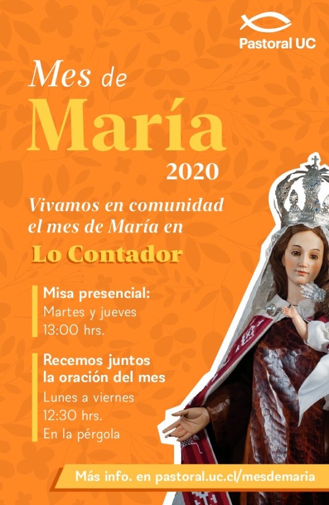 3. Celebración del Mes de María, que es lunes a viernes a las 12.30hrs en la pérgola del Patio de los Naranjos: http://pastoral.uc.cl/proyecto/mes-de-maria/
