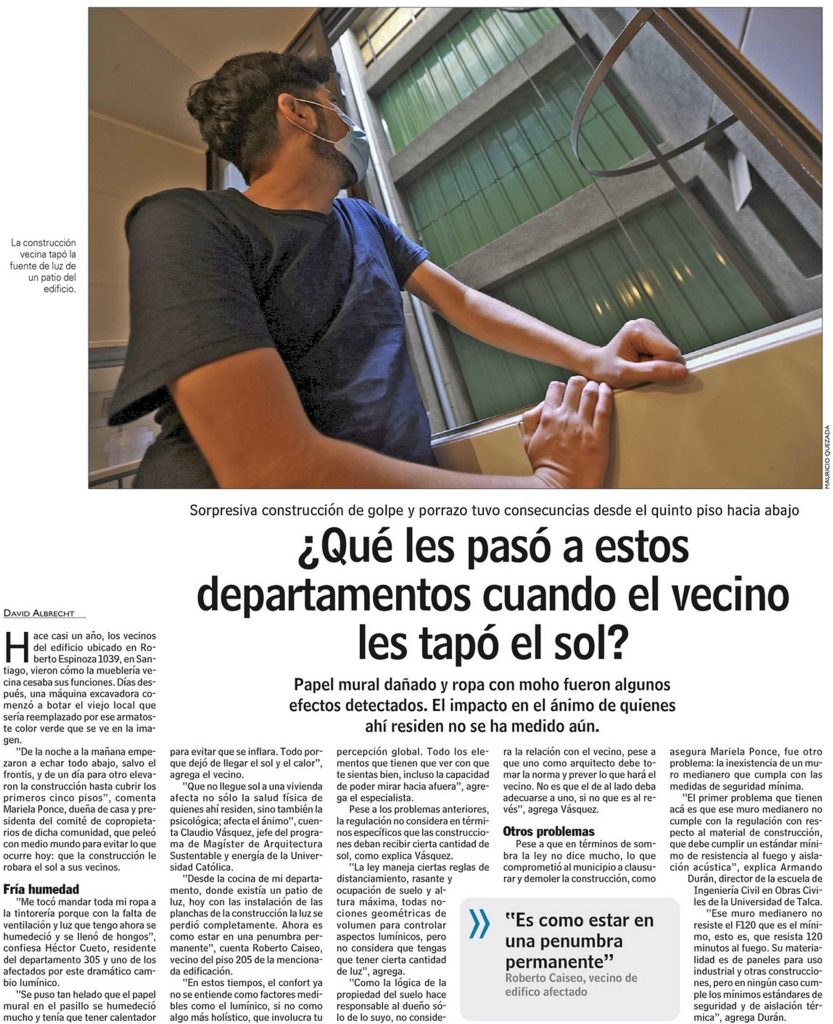 Las Últimas Noticias destaca que vecinos de edificio en Santiago denuncian que construcción vecina les tapo el sol y les generó serios problemas en sus departamentos. Habla Claudio Vásquez, jefe del programa de Magíster de Arquitectura Sustentable y Energía UC. + Revisa la entrevista completa aquí.