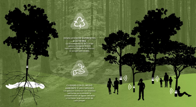 Lugün es un bosque funerario ecológico, en donde cada cuerpo se entierra bajo un árbol distinto (rito que proviene de la cultura mapuche: los muertos se “quedan” en el árbol y los tenemos más cerca). Cada árbol cuenta con un patrón único escaneable, que lleva a una biografía musical personal, con una foto de perfil, el nombre y canciones previamente elegidas por el difunto o sus familiares; y un sensor que permite reproducir la música de manera automática a medida que se camina por el bosque acercándose a los distintos árboles. Así, a través de la música y la naturaleza, podemos conocer y conectar con los que partieron.