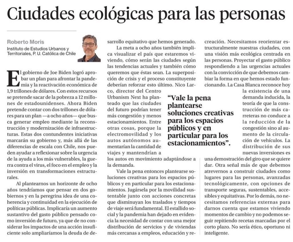 La Segunda publica columna del académico del Instituto de Estudios UrbanosRoberto Moris: “Ciudades ecológicas para las personas”. + Revisa columna completa aquí.