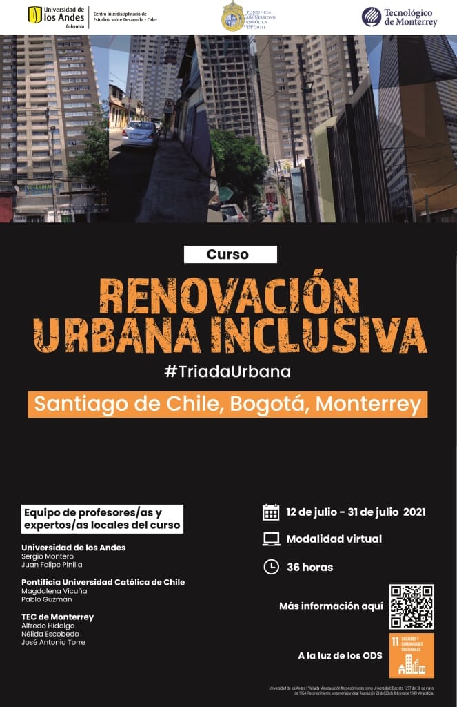 “Renovación Urbana Inclusiva” es el nombre del curso de postgrado que dictarán este año, simultáneamente, el Instituto de Estudios Urbanos y Territoriales UC, la Escuela Nacional de Arquitectura, Arte y Diseño del Tecnológico de Monterrey (México), y el Centro Interdisciplinario de Estudios sobre Desarrollo (CIDER) de la Universidad de los Andes de Bogotá (Colombia).