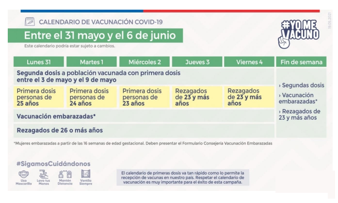 Este lunes 31 de mayo comenzó el proceso de vacunación contra el coronavirus para los(as) jóvenes que tienen 25 años o menos, comenzando por el grupo de 25 a 23 años quienes recibirán su primera dosis entre el 31 de mayo y el 4 de junio. Adicionalmente, durante el sábado 5 y domingo 6 de junio, también se seguirá vacunando a personas que vayan por sus segundas dosis (cuya primera dosis se les administró la segunda semana de mayo), embarazadas y rezagados de 23 años o más.