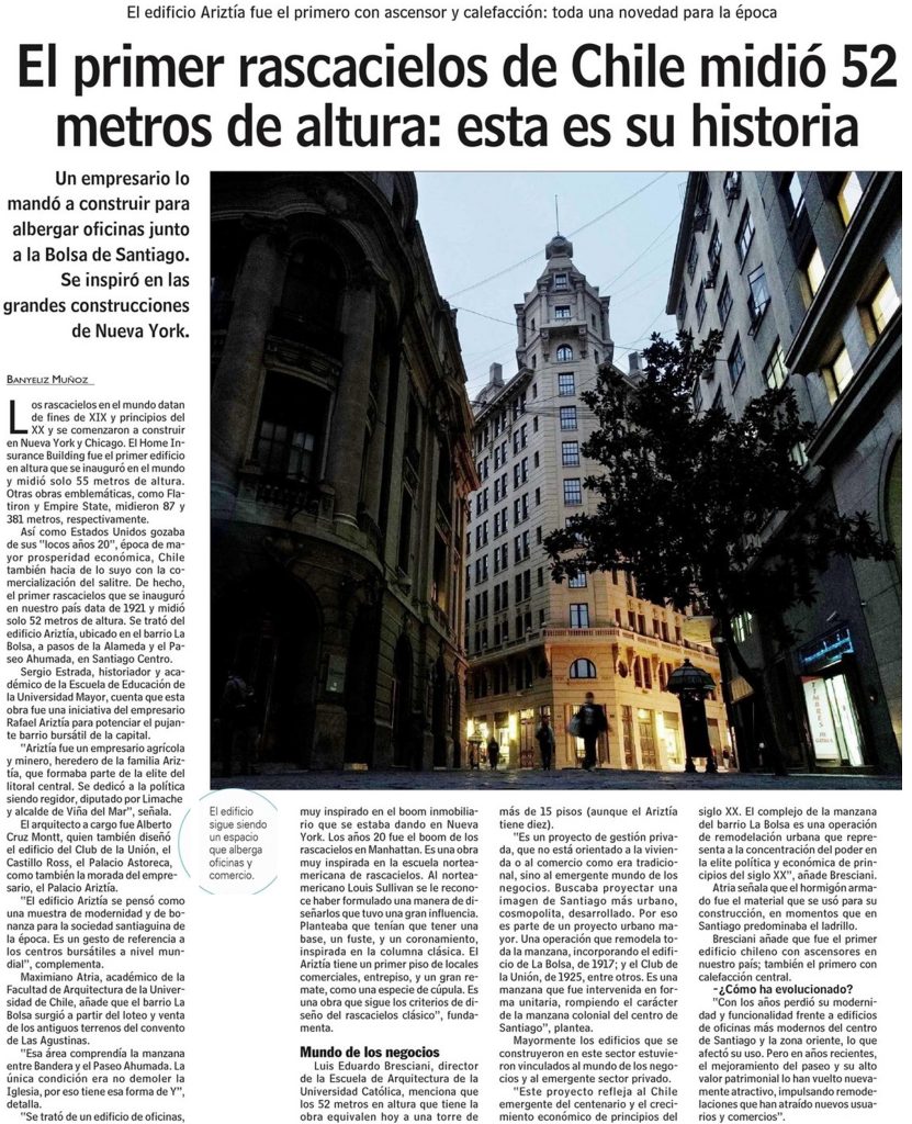 Las Últimas Noticias destaca la historia del primer rascacielos de Chile, que midió 52 metros de altura y data de 1921. Habla Luis Eduardo Bresciani, director de la escuela de Arquitectura.