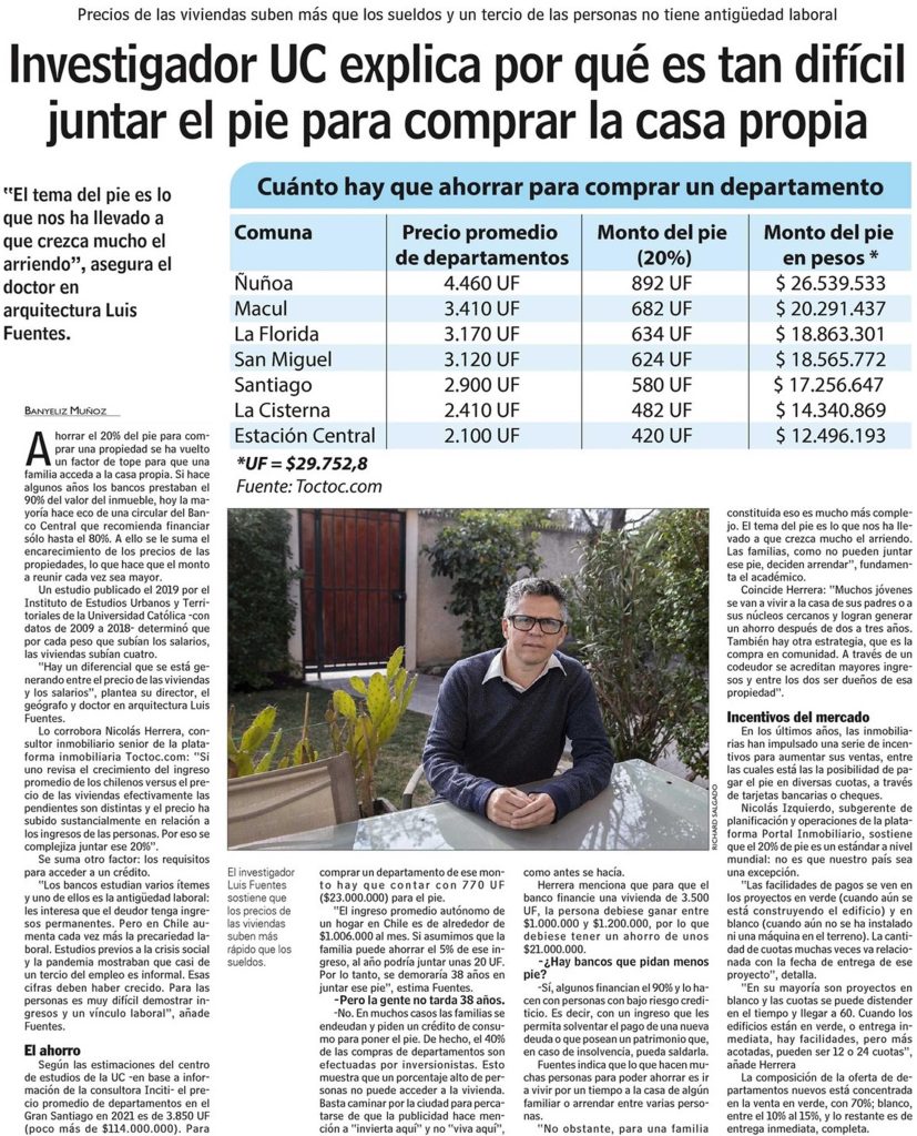 Las Últimas Noticias destaca que estudio UC explica por qué es tan difícil juntar el pie para comprar la casa propia: precios de las viviendas suben más que los sueldos y un tercio de las personas no tiene antigüedad laboral. Habla Luis Fuentes, director del Instituto de Estudios Urbanos. + Revisa nota completa aquí.