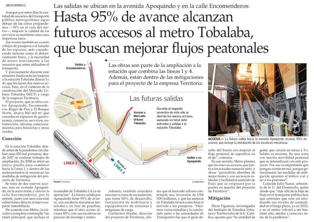 El Mercurio destaca que hasta un 95% de avance alcanzan futuros accesos al metro Tobalaba, que buscan mejorar flujos peatonales. Las obras son parte de la ampliación a la estación que combina las líneas 1 y 4. Habla el investigador del IEUT Óscar Figueroa.
