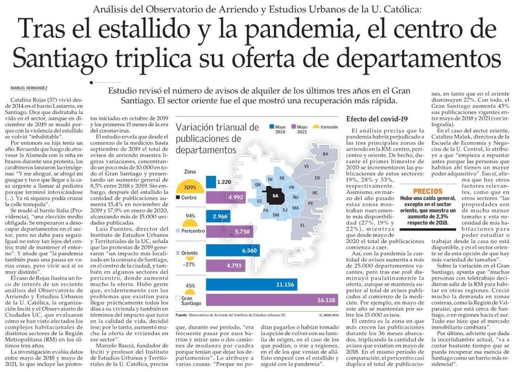 El Mercurio destaca que tras el estallido y la pandemia, el centro de Santiago triplicó su oferta de departamentos. La información es parte de los resultados del análisis del Observatorio de Arriendo y Estudios Urbanos UC, la organización Inciti y el Observatorio de Ciudades UC, sobre cómo se han visto afectados los complejos habitacionales de distintos sectores de la Región Metropolitana en los últimos tres años. Habla Luis Fuentes, director del instituto, y el profesor Marcelo Bauzá. Otros medios citan la publicación.