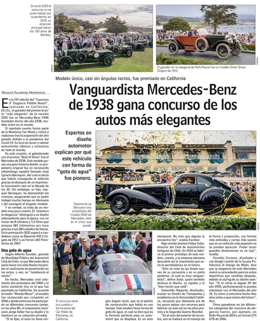 Las Últimas Noticias destaca que Mercedes-Benz de 1938 gana concurso de los autos más elegantes en California. Habla el académico Sebastián Negrete. + Revisa nota completa aquí.