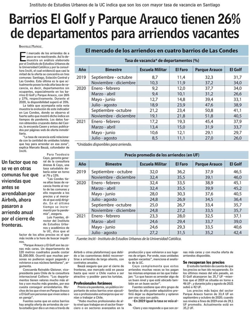 Las Últimas Noticias destaca que análisis elaborado por el instituto y la consultora Inciti revela que casi la mitad de la oferta de arriendos en la Región Metropolitana se concentra en tres comunas: Santiago, Estación Central y Las Condes y esta última tiene la más alta tasa de vacancia. Habla Luis Fuentes, director del instituto.