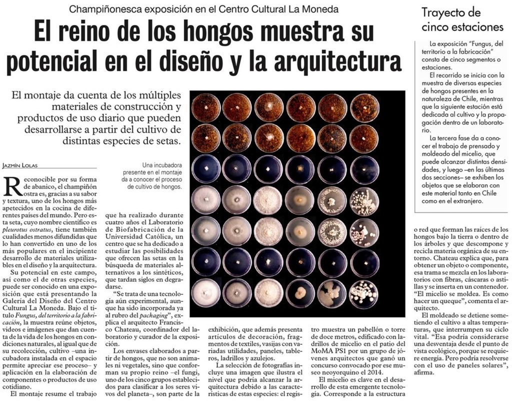 Las Últimas Noticias destaca la exposición Fungus. Del territorio a la fabricación, que está presentando la Galería del Diseño del Centro Cultural La Moneda. El montaje da cuenta de los múltiples materiales de construcción y productos de uso diario que pueden desarrollarse a partir del cultivo de distintas especies de setas y resume el trabajo del Laboratorio de Biofabricación UC. Habla el arquitecto Francisco Chateau, coordinador del laboratorio y curador de la exposición.