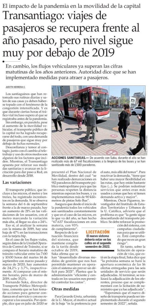 El Mercurio publica que viajes de pasajeros en Transantiago se recuperan frente al año pasado, pero nivel sigue muy por debajo de 2019. Desconfianza y temor al contagio, junto con el cambio al teletrabajo y uso de otros modos de transporte son algunos de los factores que inciden. Habla el académico del IEUT Óscar Figueroa.