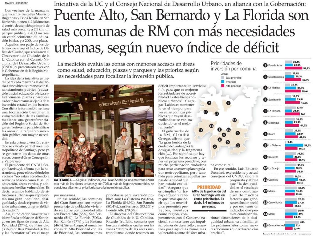 El Mercurio destaca que Puente Alto, San Bernardo y La Florida son las comunas de la Región Metropolitana con más necesidades urbanas, según nuevo Índice de Déficit de Ciudad, que realizaron el Observatorio de Ciudades UC y el Consejo Nacional del Desarrollo Urbano. La idea de la iniciativa es medir para cada manzana la distancia […]