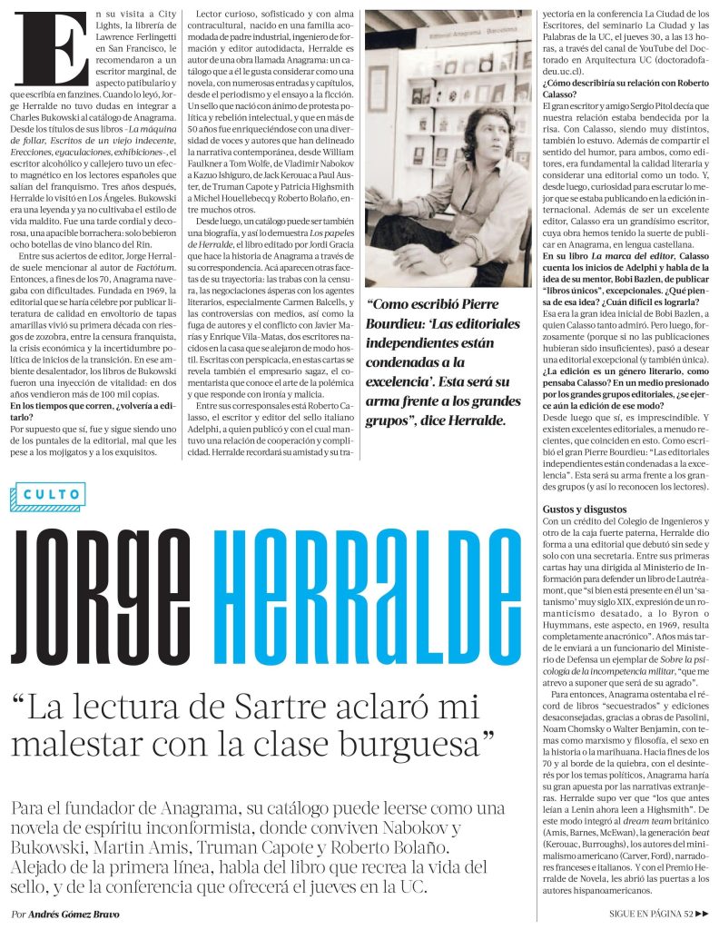 La Tercera entrevista al fundador de Anagrama Jorge Herralde sobre su trayectoria y la conferencia sobre Roberto Calasso que ofrecerá el jueves en el marco del ciclo UC La Ciudad de los Escritores. + Revisa entrevista completa aquí.