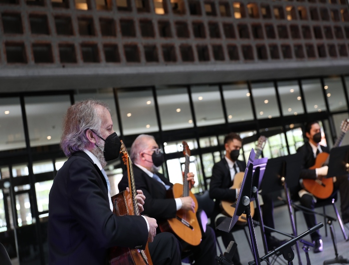 Al cierre de los discursos y previo al corte de cinta de la inauguración, el patio central de este recinto refugió los sonidos, ecos y aplausos que vinieron con la performance del Ensamble de Guitarras Oriente, integrado por los profesores Luis Castro y Luis Orlandini y los estudiantes Andrés Bizarro y Raimundo Luco.
