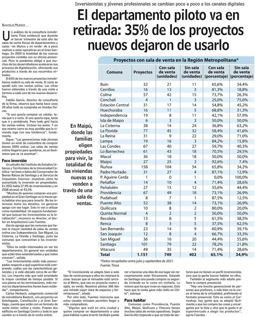 Las Últimas Noticias destaca que el 35% de los proyectos inmobiliarios nuevos dejaron de usar el departamento piloto y lo reemplazaron por canales digitales. Se menciona un estudio del instituto sobre aumento de la inversión en propiedades. Habla el director del IEUT, Luis Fuentes.