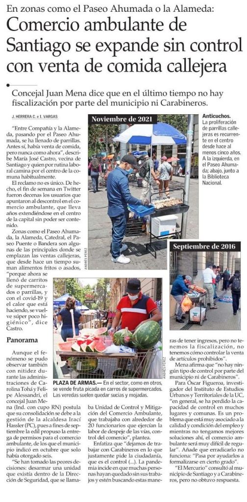 El Mercurio destaca que el comercio ambulante de Santiago se expande sin control con venta de comida callejera. Habla el investigador del IEUT, Óscar Figueroa.