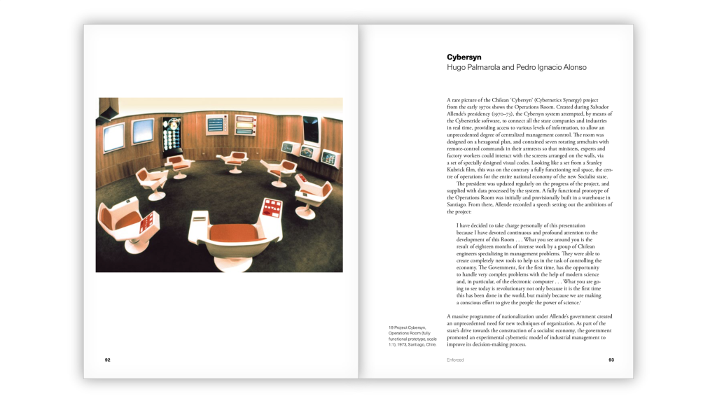 “El sistema Cybersyn intentó, mediante el software Cyberstride, conectar todas las empresas e industrias estatales en tiempo real, proporcionando acceso a varios niveles de información, para permitir un grado sin precedentes de control de la gestión centralizada. (…) En marzo de 1972 la computadora procesó el primer grupo de datos (…). Aunque otros países desarrollaron tecnologías que guardaban cierta similitud con Cybersyn, el concepto y los objetivos del proyecto chileno fueron prácticamente únicos.”