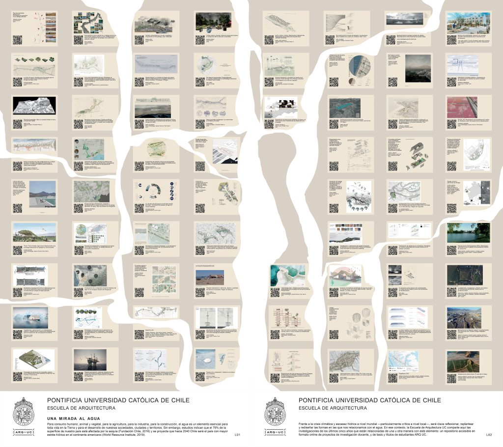 La participación ARQ UC en la muestra de universidades se tituló “Una mirada al agua”, entendiendo la urgencia global y local en torno a esta temática: estudios indican que el 76% de la superficie de nuestro país está afectada por la sequía (Fundación Chile, 2016) y se proyecta que hacia 2040 Chile será el país con mayor estrés hídrico en el continente americano (World Resource Institute, 2019). De esta forma, se presentaron en las dos láminas de la trienal una composición que reúne las investigaciones ARQ UC de los últimos cinco años relacionados de una u otra manera a este elemento, compartiendo así con los visitantes de la trienal un repositorio accesible en formato online —por medio de códigos QR— de proyectos de investigación docente, tesis de magíster y proyectos de título.