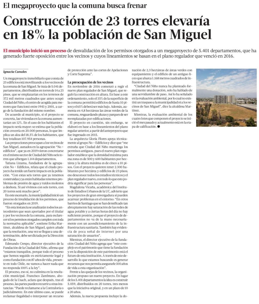 La Tercera destaca que un megaproyecto inmobiliario de 23 edificios ha generado fuerte oposición entre los vecinos de San Miguel. De acuerdo al municipio, se estima que la población crecería en 20.000 personas, lo que implica un alza del 18,5 % de los habitantes. Habla la académica del IEUT, Magdalena Vicuña.