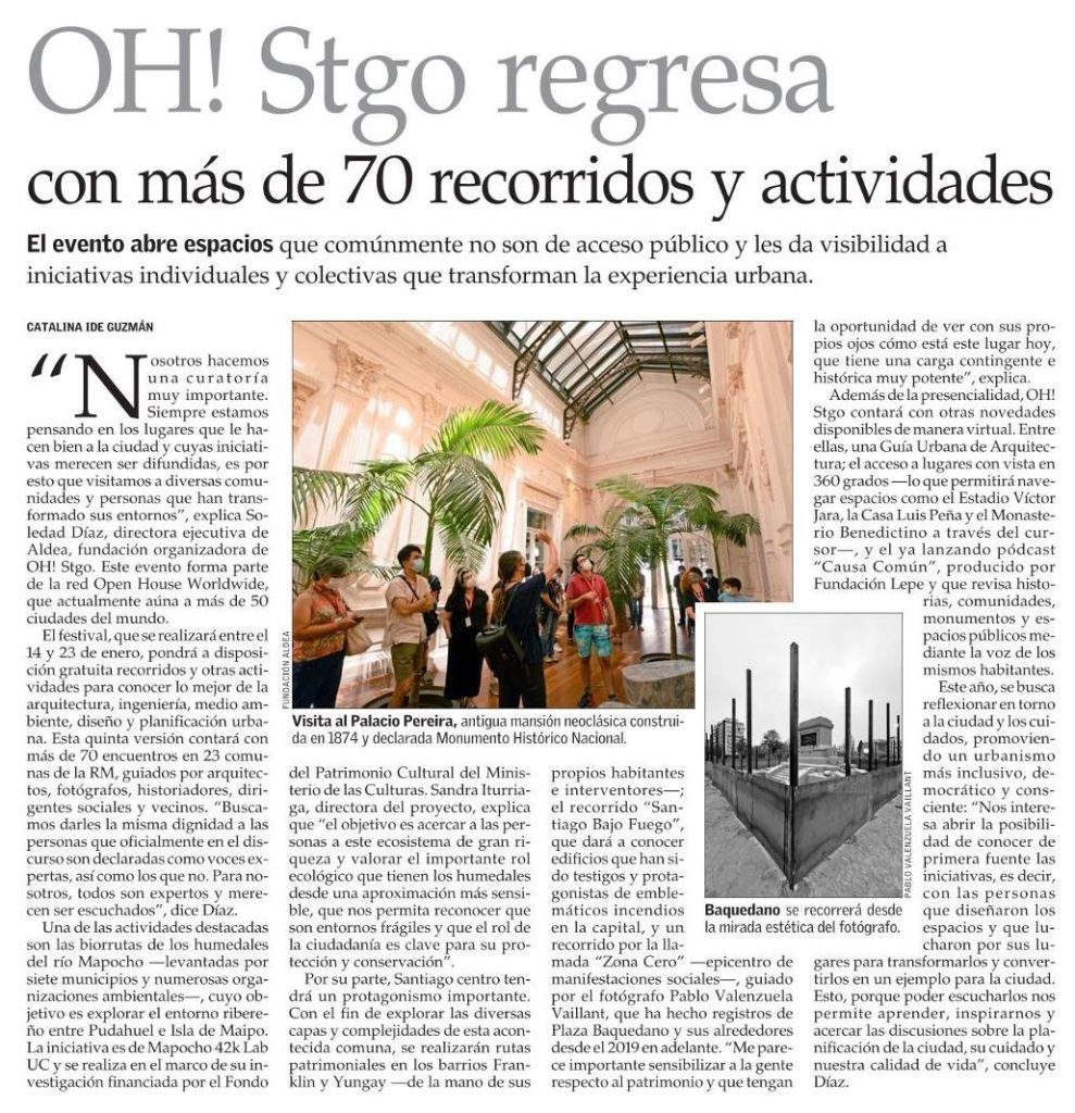 Medios destacan que OH! Stgo regresa con más de 70 recorridos y actividades. El festival, que se realizará entre el 14 y 23 de enero, pondrá a disposición gratuita recorridos y otras actividades para conocer proyectos de arquitectura, ingeniería, medio ambiente, diseño y planificación urbana. Una de las actividades destacadas son las biorrutas de los […]