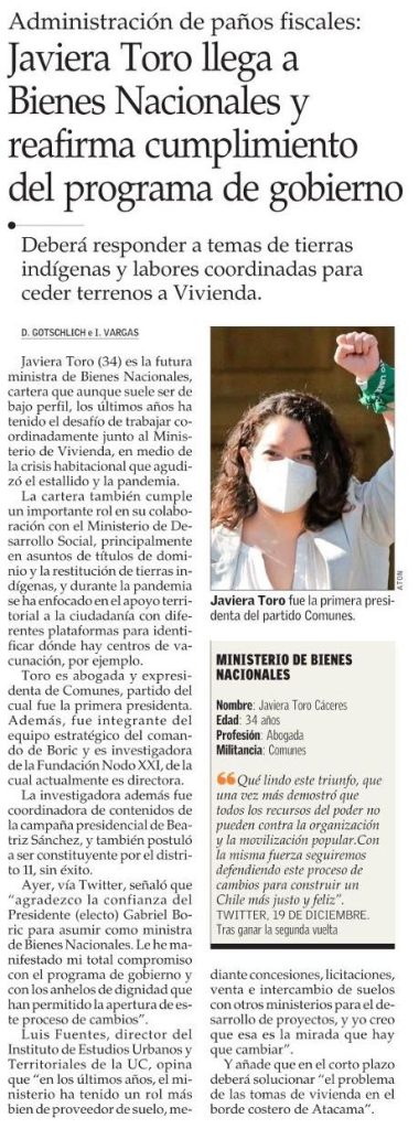El Mercurio destaca que Javiera Toro llega a Bienes Nacionales donde deberá responder a temas de tierras indígenas y desarrollar labores coordinadas para ceder terrenos a Vivienda. Habla Luis Fuentes, director del instituto.