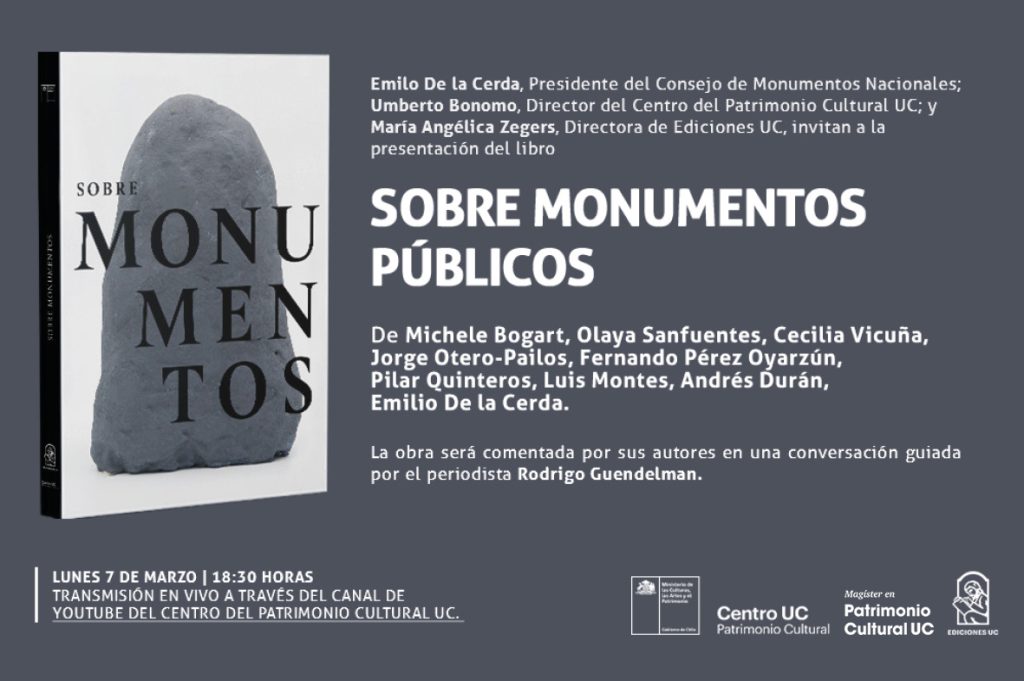 Este lunes 7 de marzo de 2022 en el Salón de Honor de la Pontificia Universidad Católica de Chile se efectuó el lanzamiento del libro “Sobre Monumentos Públicos”, que nace del trabajo mancomunado entre la Subsecretaría del Patrimonio Cultural, la Secretaría Técnica del Consejo de Monumentos Nacionales y del Centro del Patrimonio Cultural de la Pontificia Universidad Católica de Chile, edición que reúne diversas miradas de autores que con sus estudios buscan abrir un espacio de reflexión y discusión en torno a los monumentos públicos.