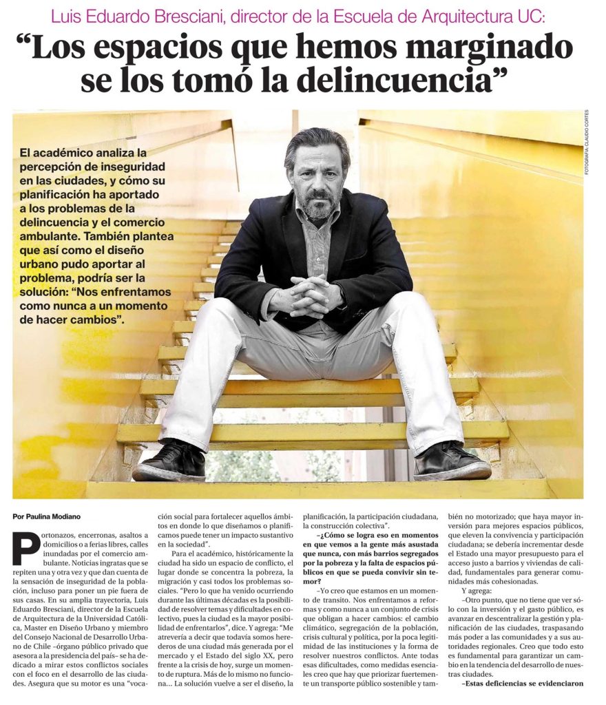 La Segunda entrevista a Luis Eduardo Bresciani, director de la escuela de Arquitectura, sobre la percepción de inseguridad en las ciudades y cómo su planificación ha aportado a los problemas de la delincuencia y el comercio ambulante.