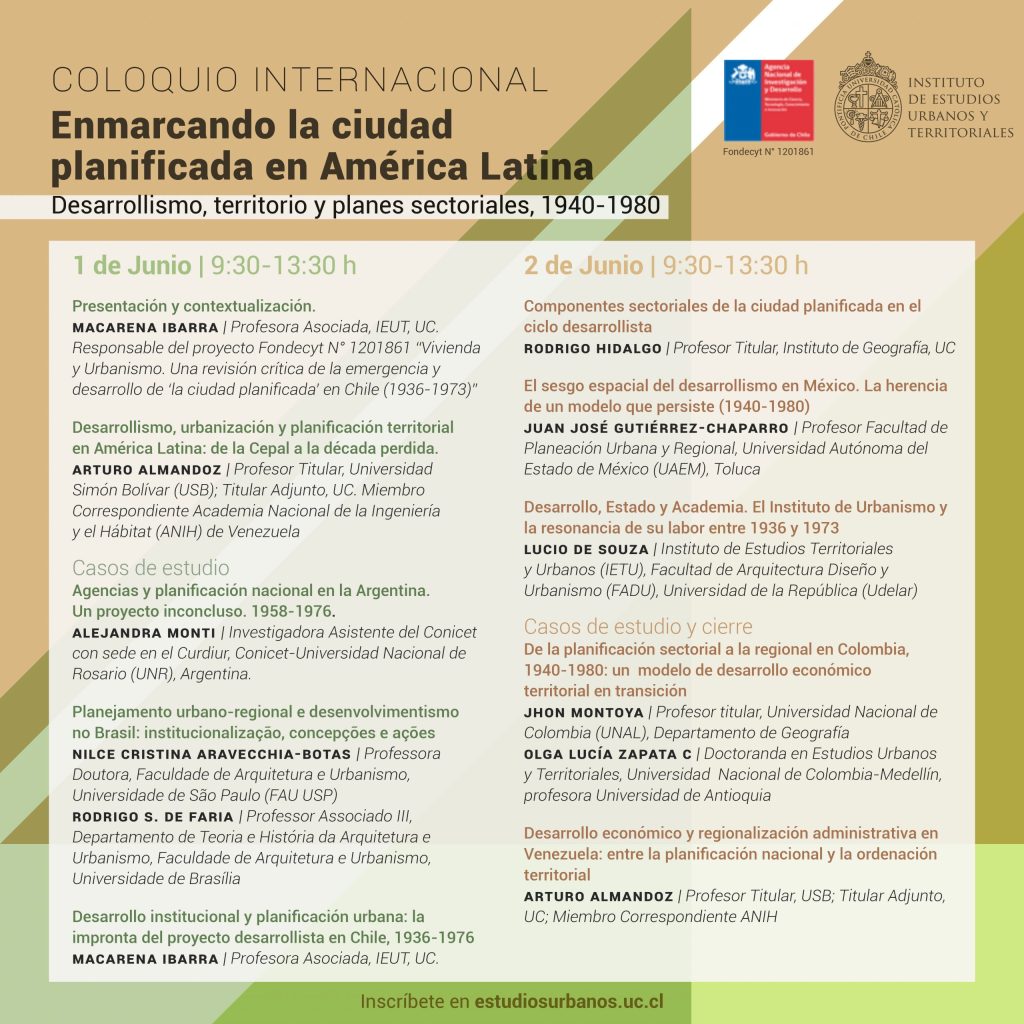 El coloquio se desarrolló en dos jornadas y fue producto del proyecto Fondecyt N°1201861 titulado «Vivienda y Urbanismo. Una revisión crítica de la emergencia y desarrollo de ‘la ciudad planificada’ en Chile (1936-1973)» desarrollado por la profesora Macarena Ibarra como investigadora responsable. En colaboración internacional con el profesor Arturo Almandoz. Y con los profesores Germán Hidalgo de la Escuela de Arquitectura y Rodrigo Hidalgo del Instituto de Geografía como co-investigadores.