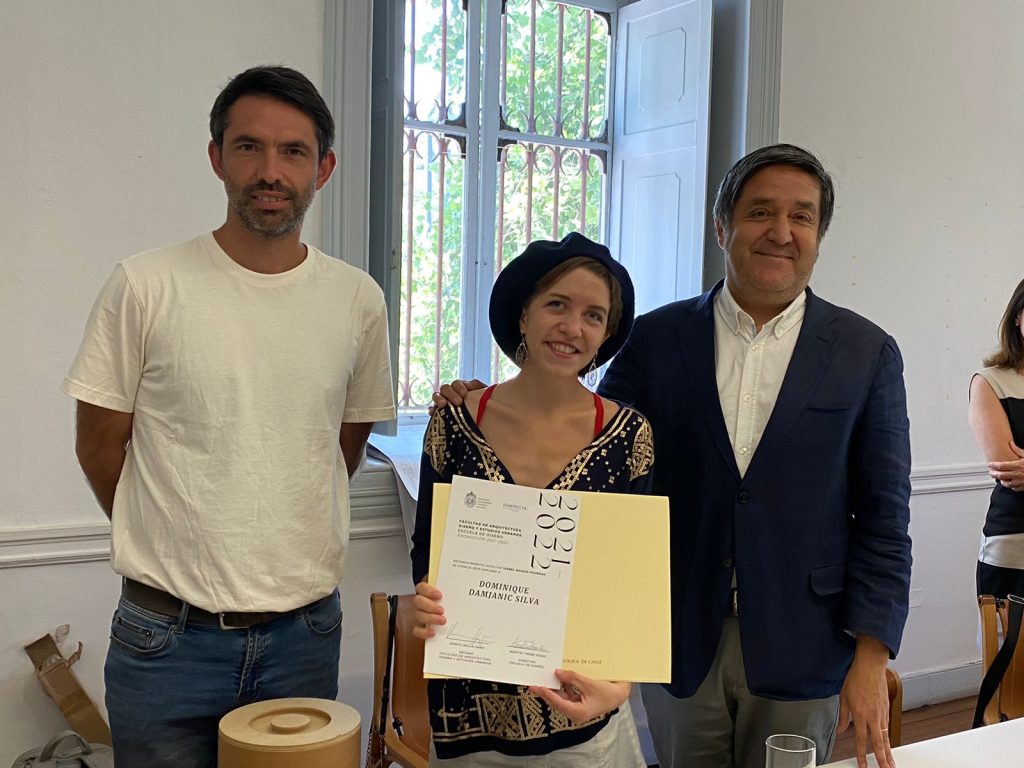 La exestudiante Dominique Damjanic, Diseñadora UC, titulada y egresada el presente 2022, quien recibió el premio Isabel Baixas, de manos del Decano de la Facultad de Arquitectura, Diseño y Estudios Urbanos, Mario Ubilla, y del Director de la escuela de Diseño, Martín Tironi, en una ceremonia realizada en la Sala de Consejo del Decanato en el campus Lo Contador.