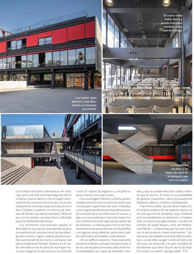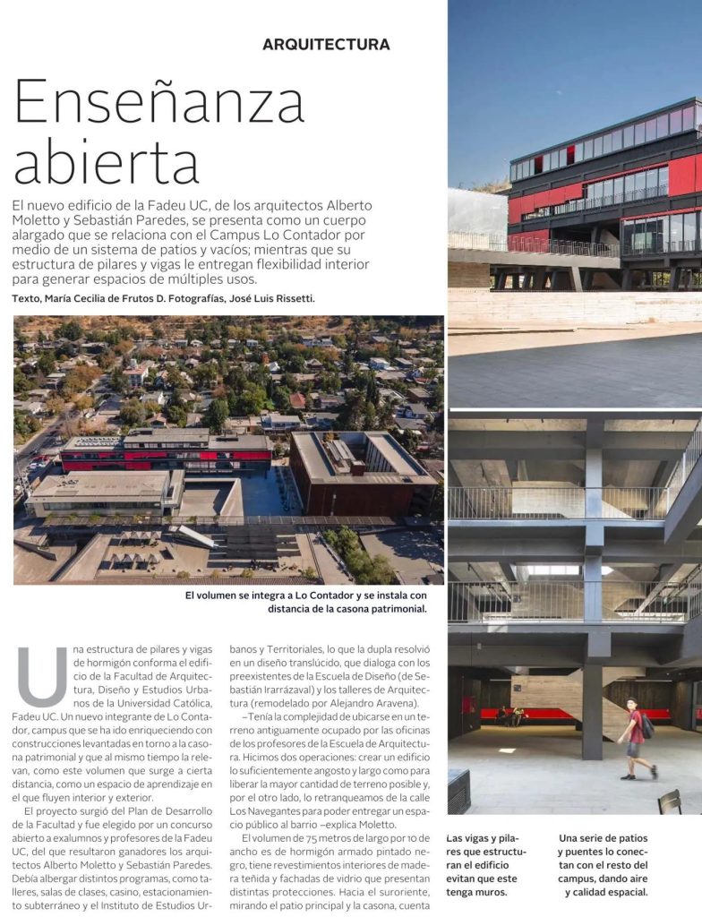 Un extenso reportaje, titulado “Enseñanza Abierta”, publicó la revista Vivienda y Decoración, del diario El Mercurio, relevando y destacando el nuevo Edificio de Facultad, de los arquitectos Alberto Moletto y Sebastián Paredes, inmueble que consolida la expansión del campus Lo Contador.