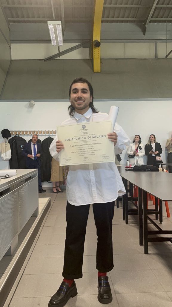 El estudiante Bryan Bachmann recibió su grado de Magíster en Diseño para el Sistema de Moda en el marco del convenio de doble titulación existente entre el Magíster en Diseño Avanzado UC -MADA- con el Politécnico de Milán -Polimi-.